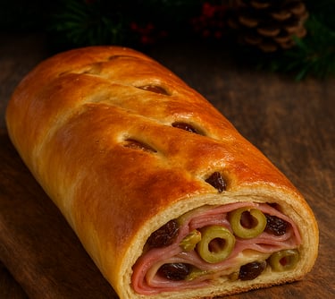 Pan relleno con jamón, tocineta y aceitunas frescas.