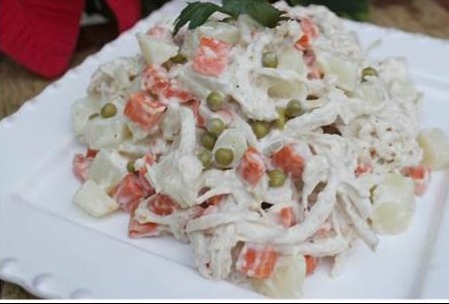 Mezcla fresca de verduras con toques dulces y cremosos. con pollo esmechado