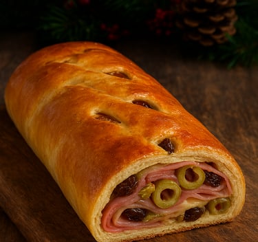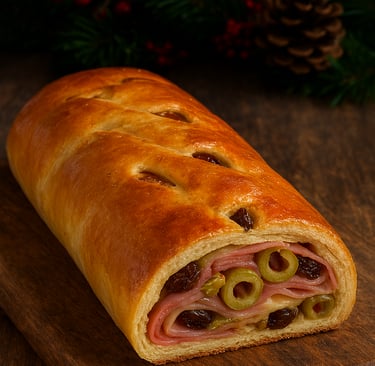 Pan relleno con jamón, tocineta y aceitunas frescas.